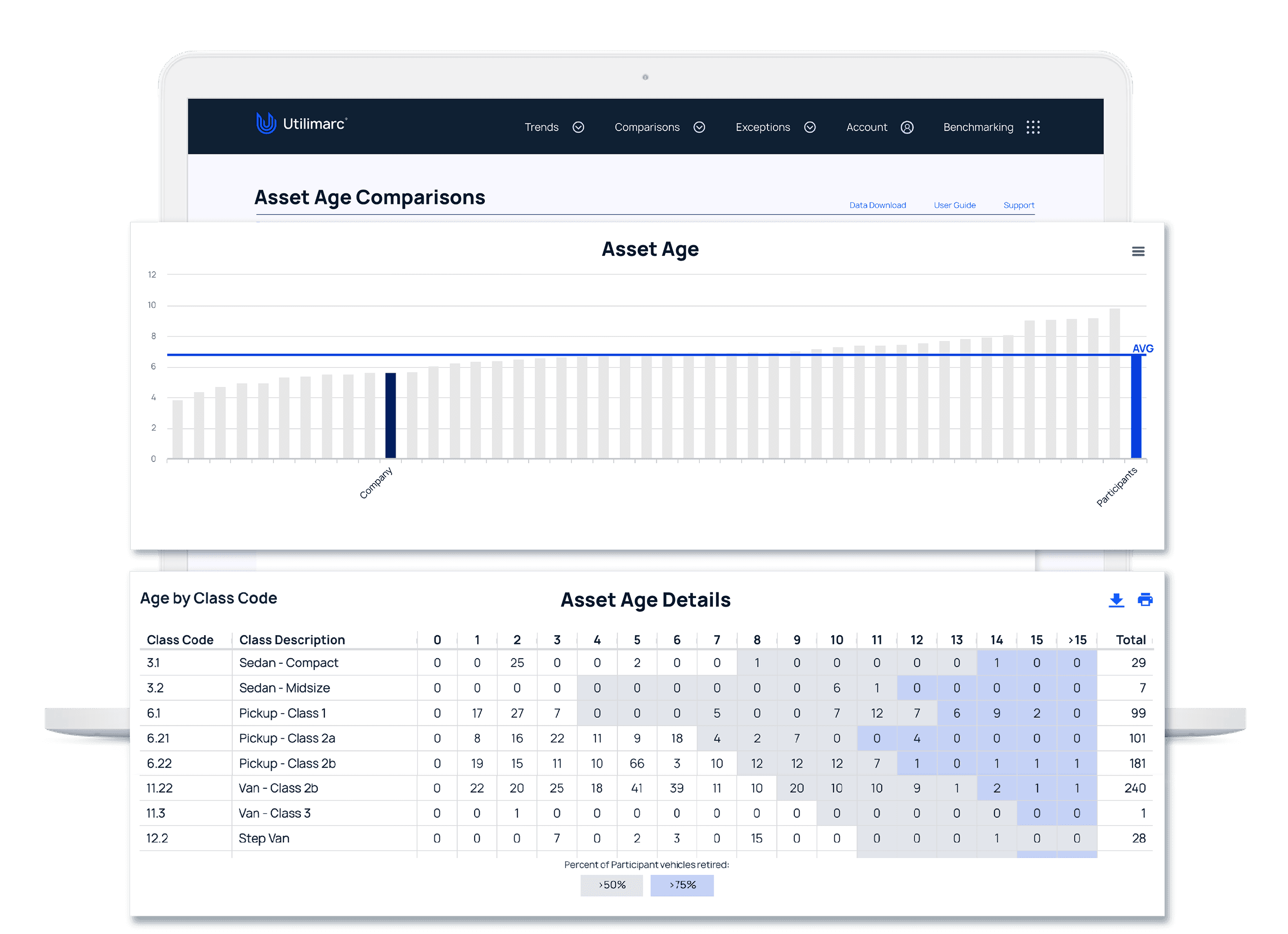 By leveraging client inventory data and comparing it with anonymized industry data our platform shows fleet assets that should consider replacing in order to be inline with industry standards. Our aging table shows which of our clients' assets would have been replaced by 50% and 75% of all other fleets.